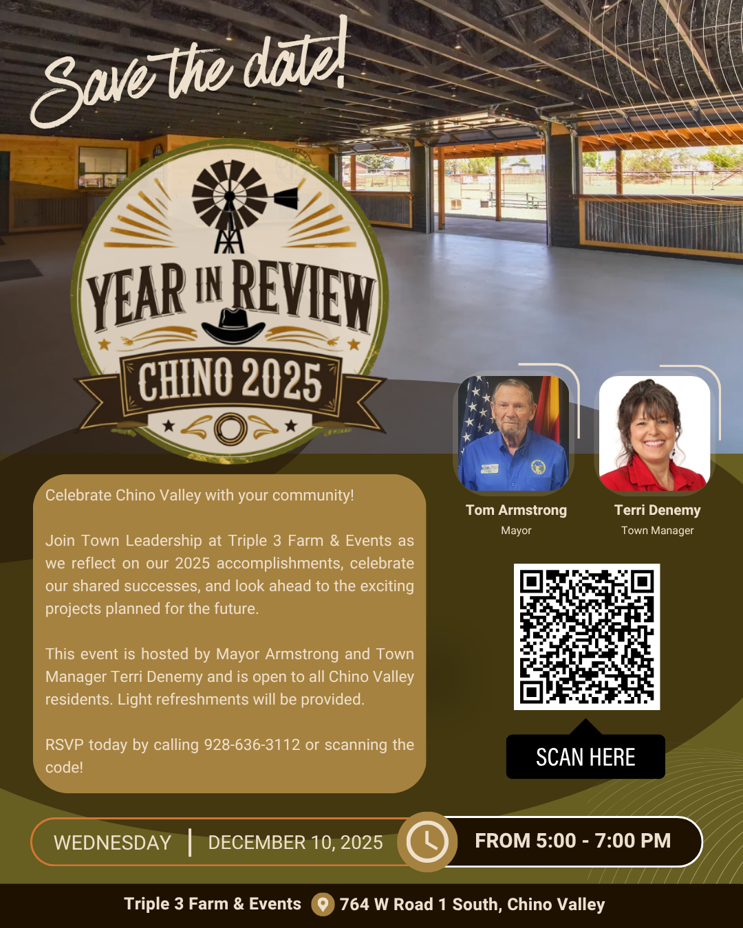 The Town of Chino Valley hosted its first-ever Year in Review event on December 10, 2025. The event was held at Triple 3 Farm and Events, with cookies baked by our own Chino Valley High School culinary students. This event brought together our Mayor and Town Council, community members, town leadership, and local partners to celebrate what we accomplished in 2025 and share a look at what’s coming in 2026. From highlights of town projects to community updates and engaging conversations, the evening reflected our commitment to keeping residents informed and involved. We look forward to continuing this event annually and sharing our progress each year.