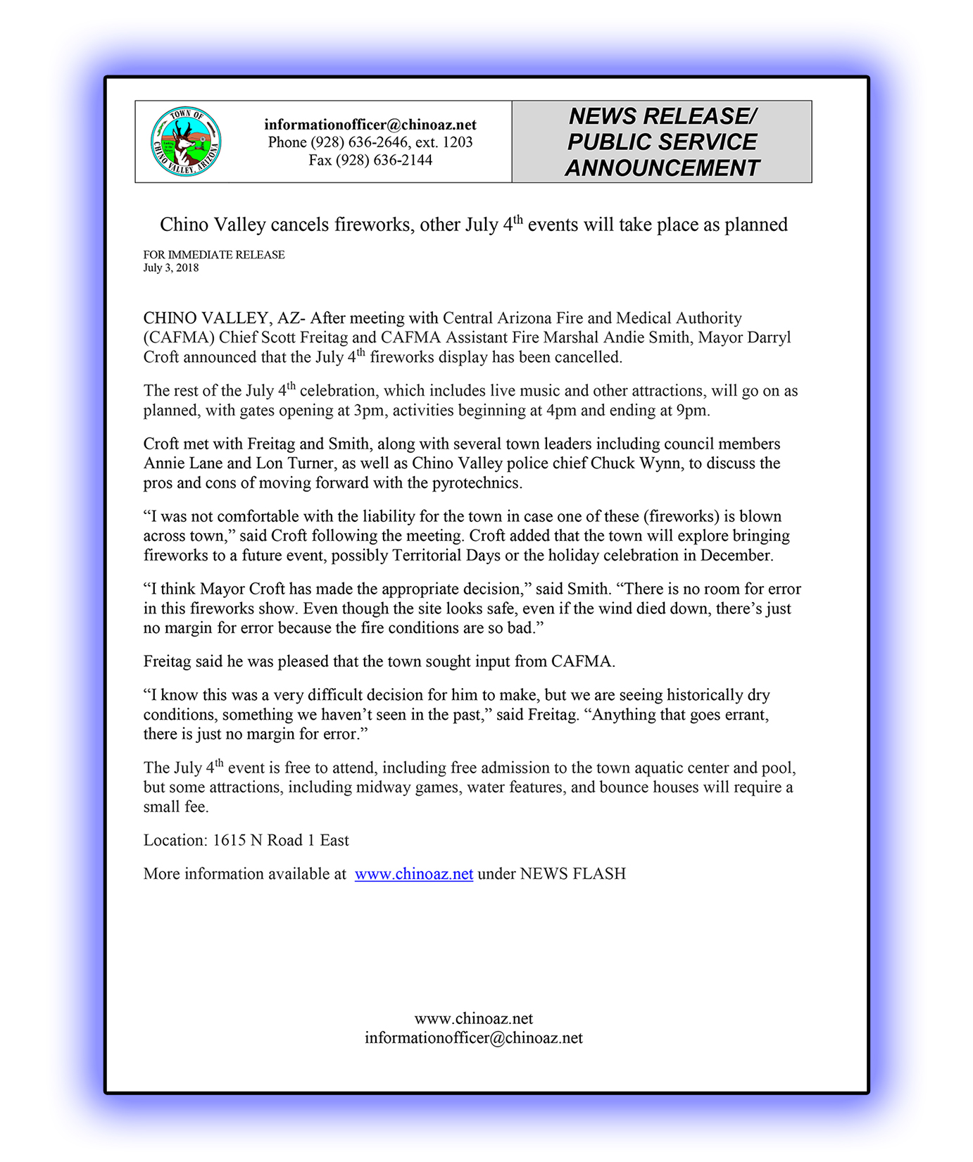 After meeting with Central Arizona Fire and Medical Authority (CAFMA) Chief Scott Freitag and CAFMA Assistant Fire Marshal Andie Smith, Mayor Darryl Croft announced that the July 4th fireworks display has been cancelled.