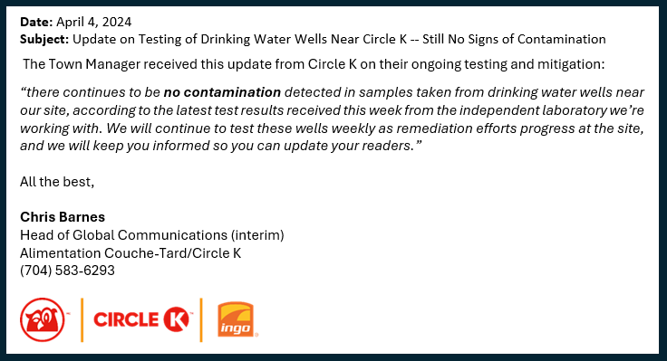 - Circle K is performing extensive weekly testing of drinking water wells in the immediate vicinity and environmental contractors have begun remediation efforts.