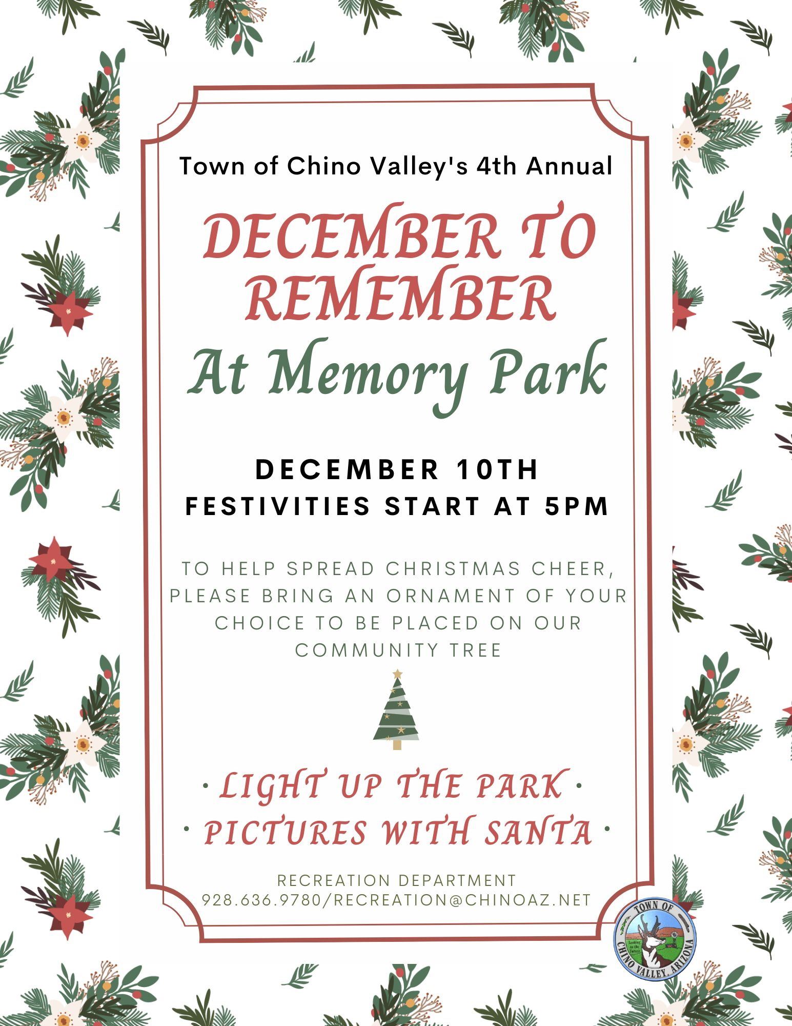 Town of Chino Valley Recreation Department presents the 4th Annual December to Remember at Memory Park on December 10, 2022. Come out and enjoy the Season!